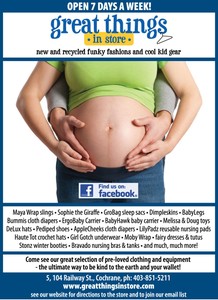 From quality consignment to the best baby gifts, visit Great Things in Store for some great finds. Located in beautiful Cochrane, Alberta, we sell a huge variety of gently used items for kids, teens, and women. We specialize in brand-name clothing and only carry the brands you love. Buying previously-loved items is not only great for your wallet, it’s a great way to reduce your impact on the planet.