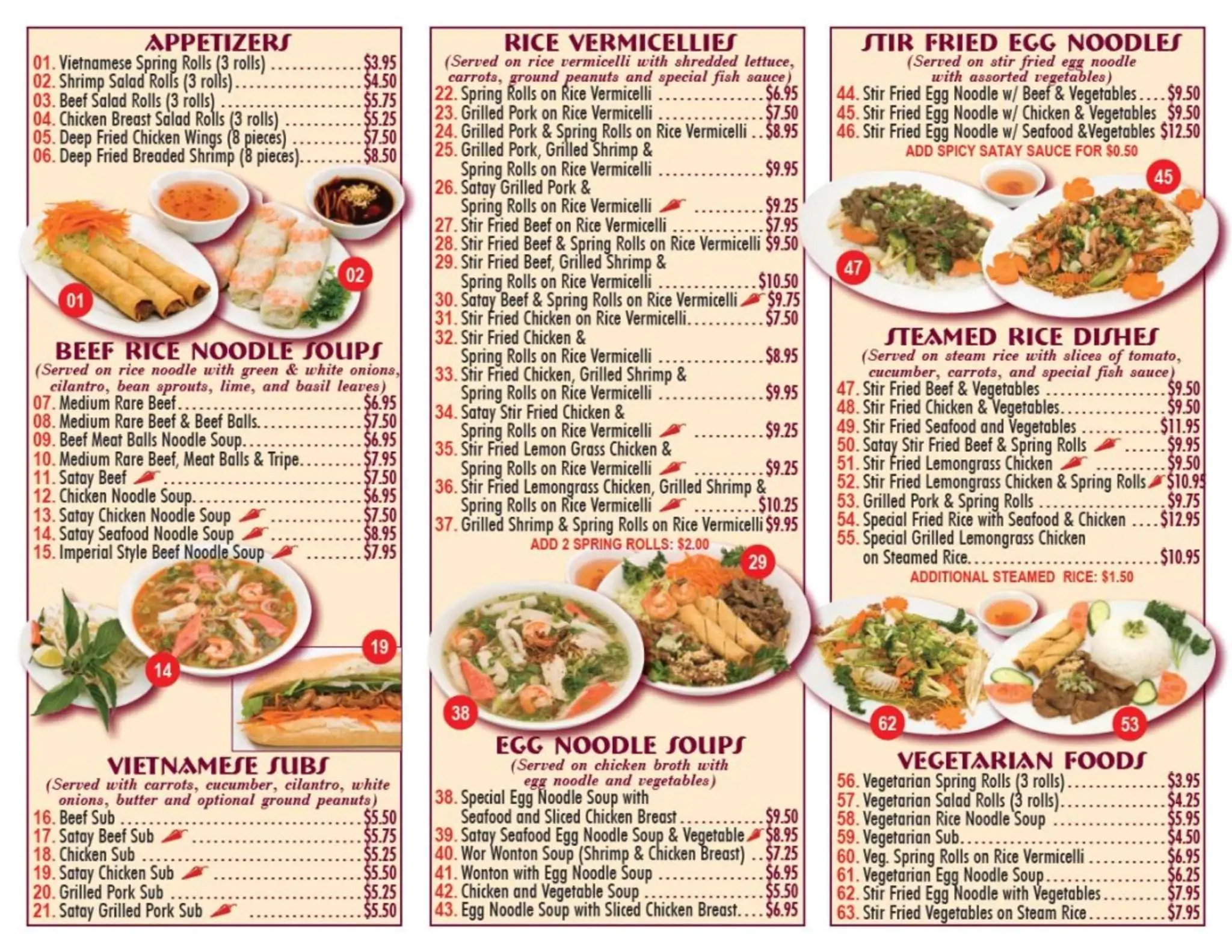 Thirst-quenching beverages , Restaurant , Vegetarian food , Beef Rice Noodle Soups , Steamed Rice Dishes , Vietnamese Food , Combos , Wide selection of Appetizers , Rice Vermicelli , Cuisine , Vietnamese subs , Egg Noodle Soups , Vietnamese Western Cuisine , Stir-Fried Egg Noodles , Food , DINING , Appetizers , Western cuisine , Western Food , Authentic Vietnamese and Western Cuisine , Friendly and welcoming staff