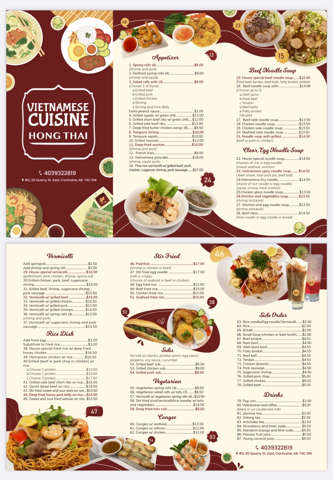 Vietnamese Restaurants in this list provide services to multiple postal codes in and around Cochrane (i.e None). For specific service areas, kindly reach out to the individual businesses.